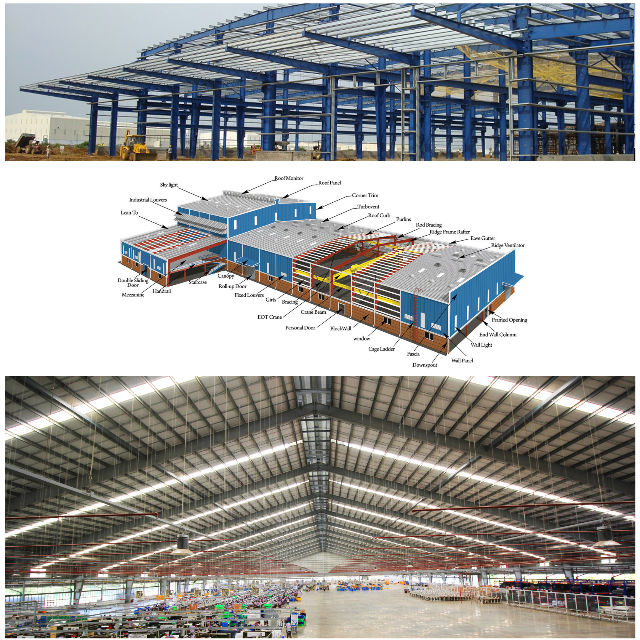 - Pre-Engineered Buildings (PEBs) – Customized, factory-fabricated